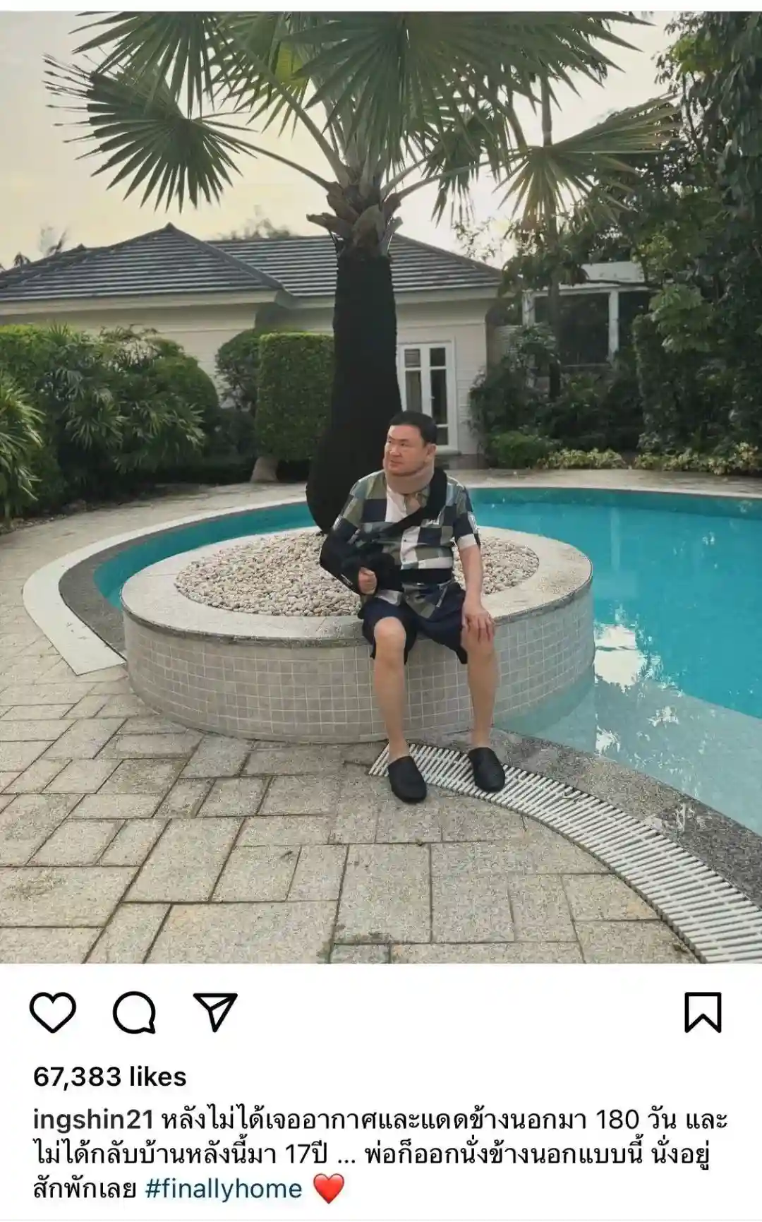 “180天看不到外面的天空和太阳,17年没有回家……爸爸就这样在外面坐了一会儿。”当地时间2月18日,泰国前总理他信的女儿贝东丹在社交媒体上发了这样一段话,配图是坐在泳池边、手臂上吊着吊带、脖子上戴着护颈圈的他信。