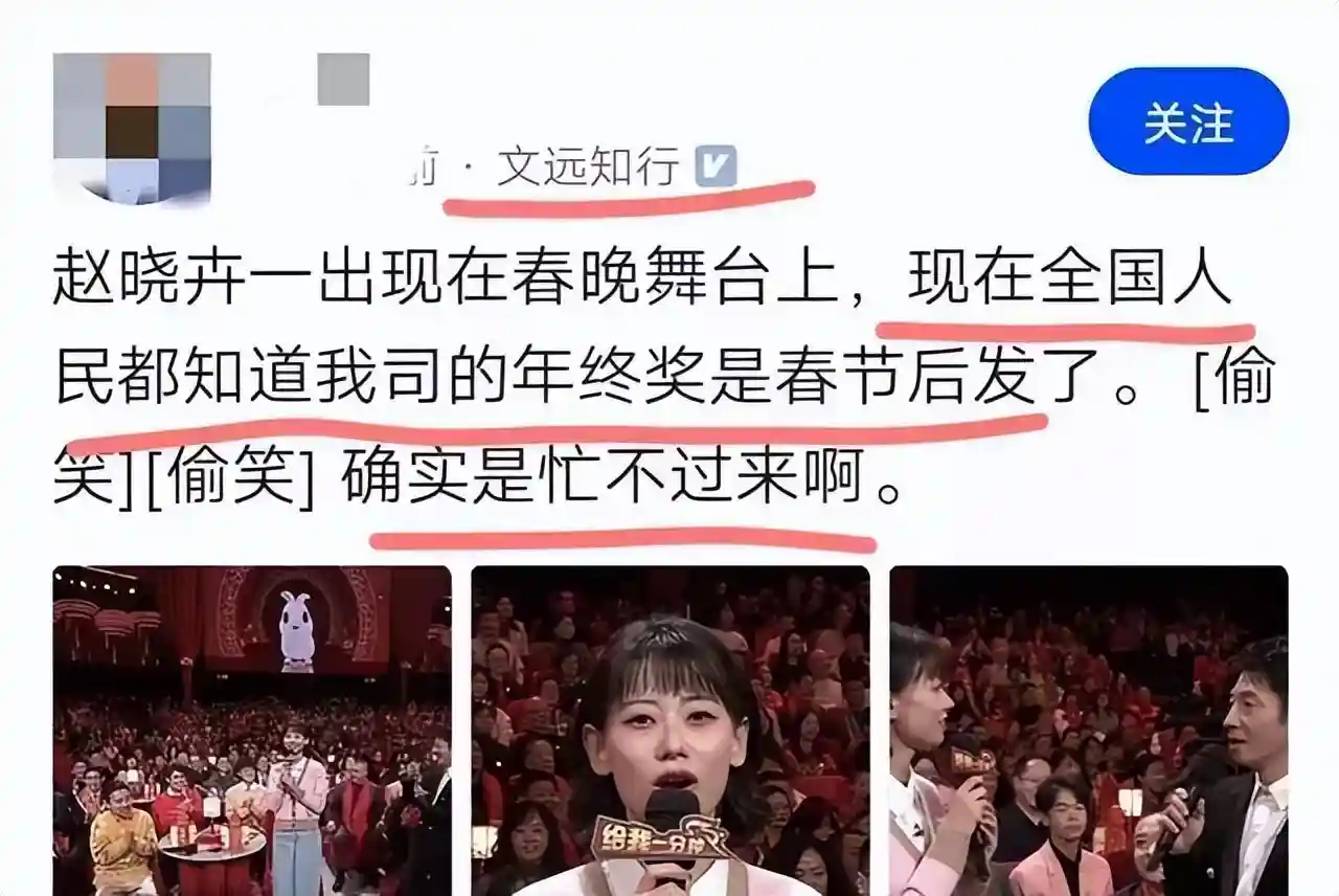 此外,赵晓卉还在春晚上开玩笑得说,自己登上春晚一事,不光自己吃惊,就连她的老板也是完全没有想到。