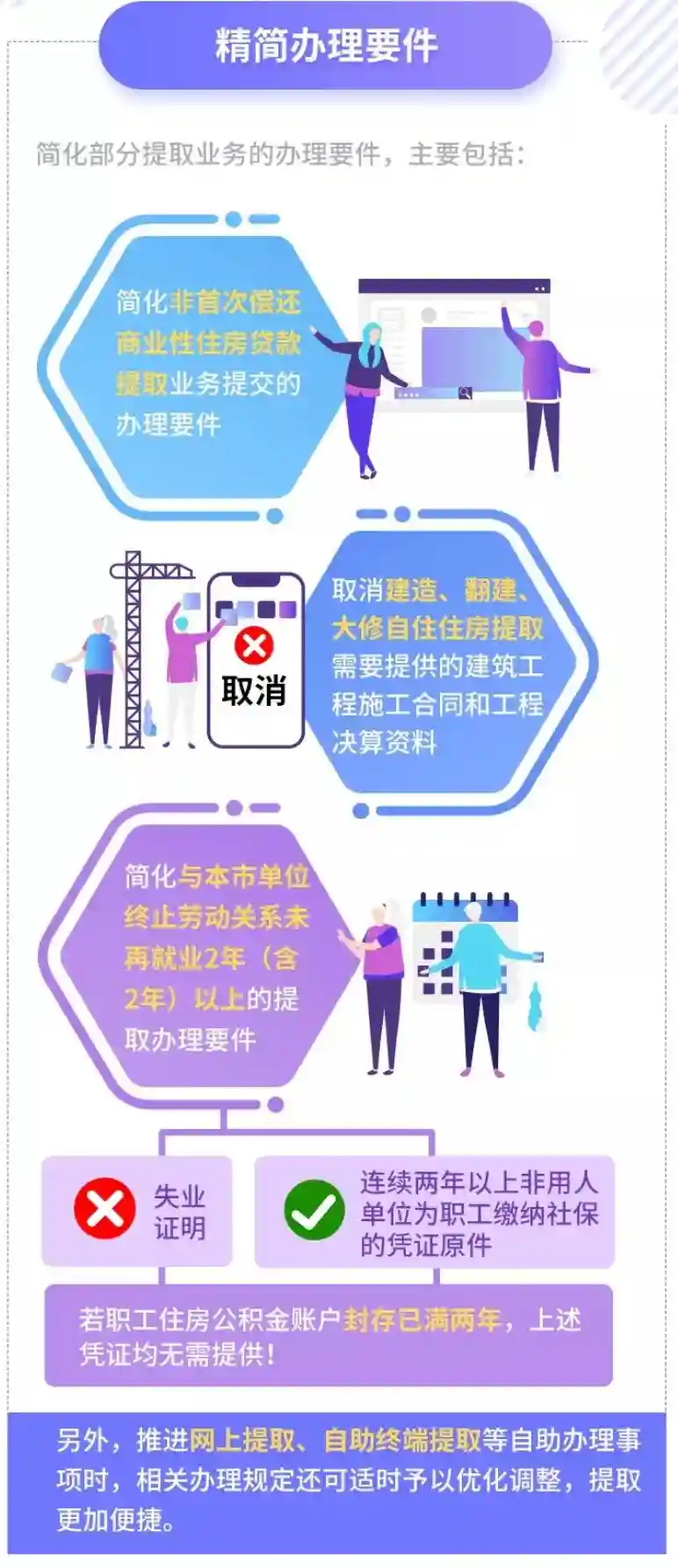 新修订的管理办法简化了部分提取业务的办理要件,主要包括: