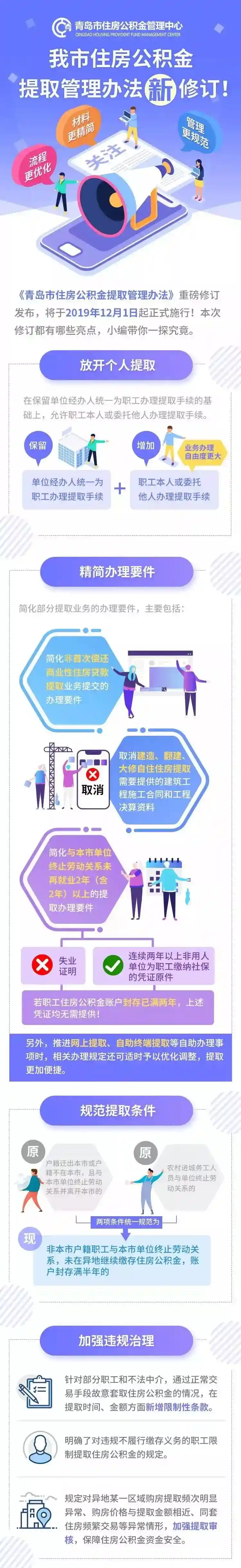 为进一步增强便民成效、强化业务管理,市住房公积金管理中心修订的《青岛市住房公积金提取管理办法》将于2019年12月1日起正式施行。