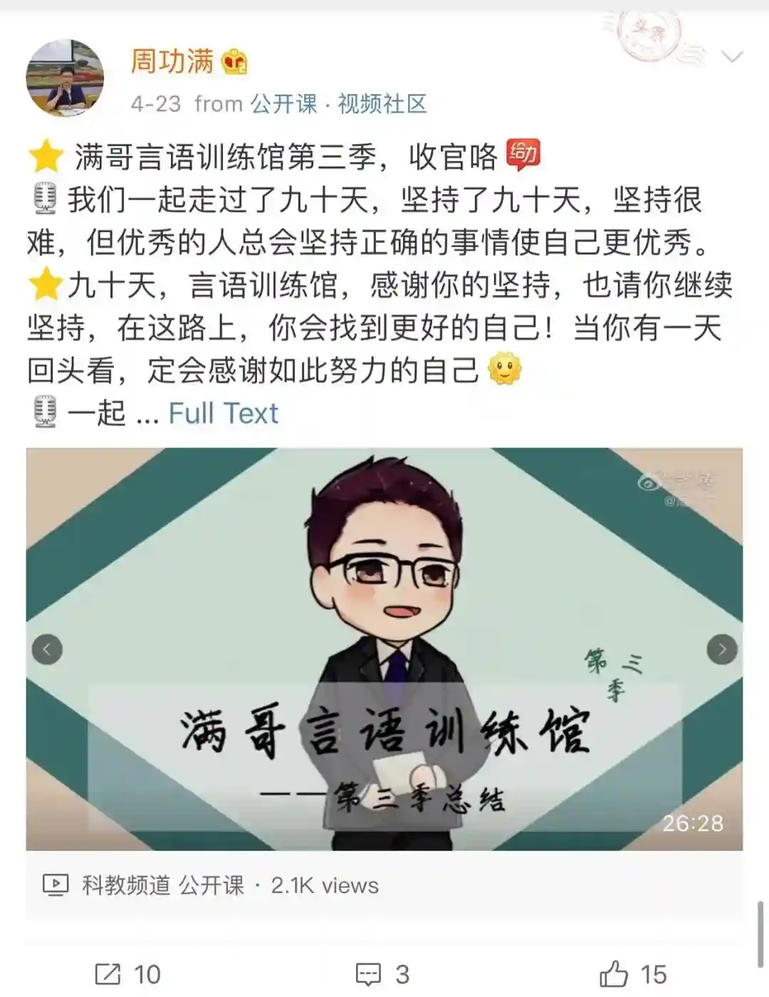 最近,周功满还开始了微博和抖音的运营。如今“周功满”微博号已经拥有10000+的粉丝量。他在线上提供语言、思维和面试等方面的训练技巧,打造出一个实用的公益学习阵地。