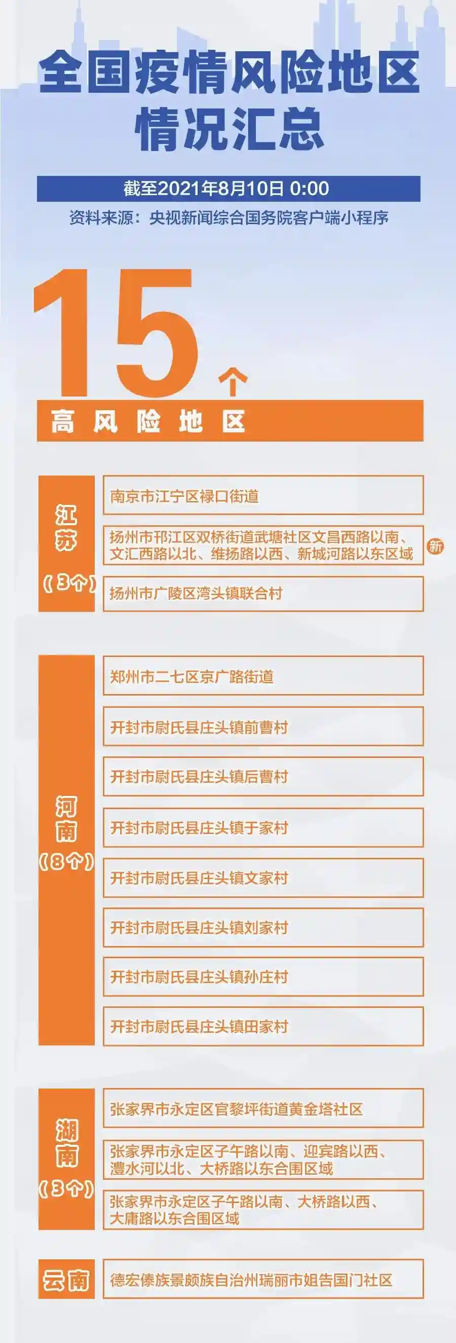 截至8月10日0时,全国共有15个高风险地区,204个中风险地区。