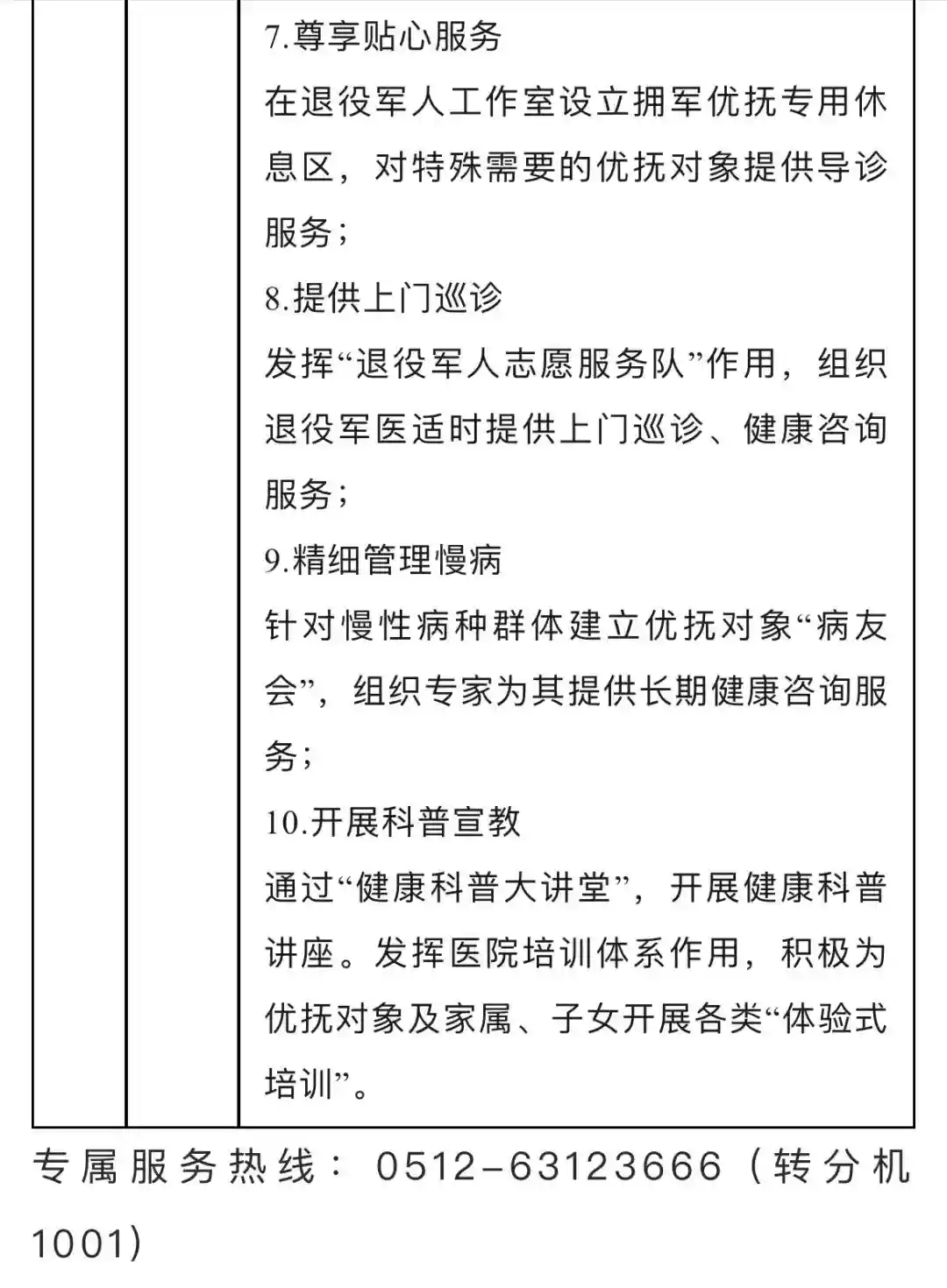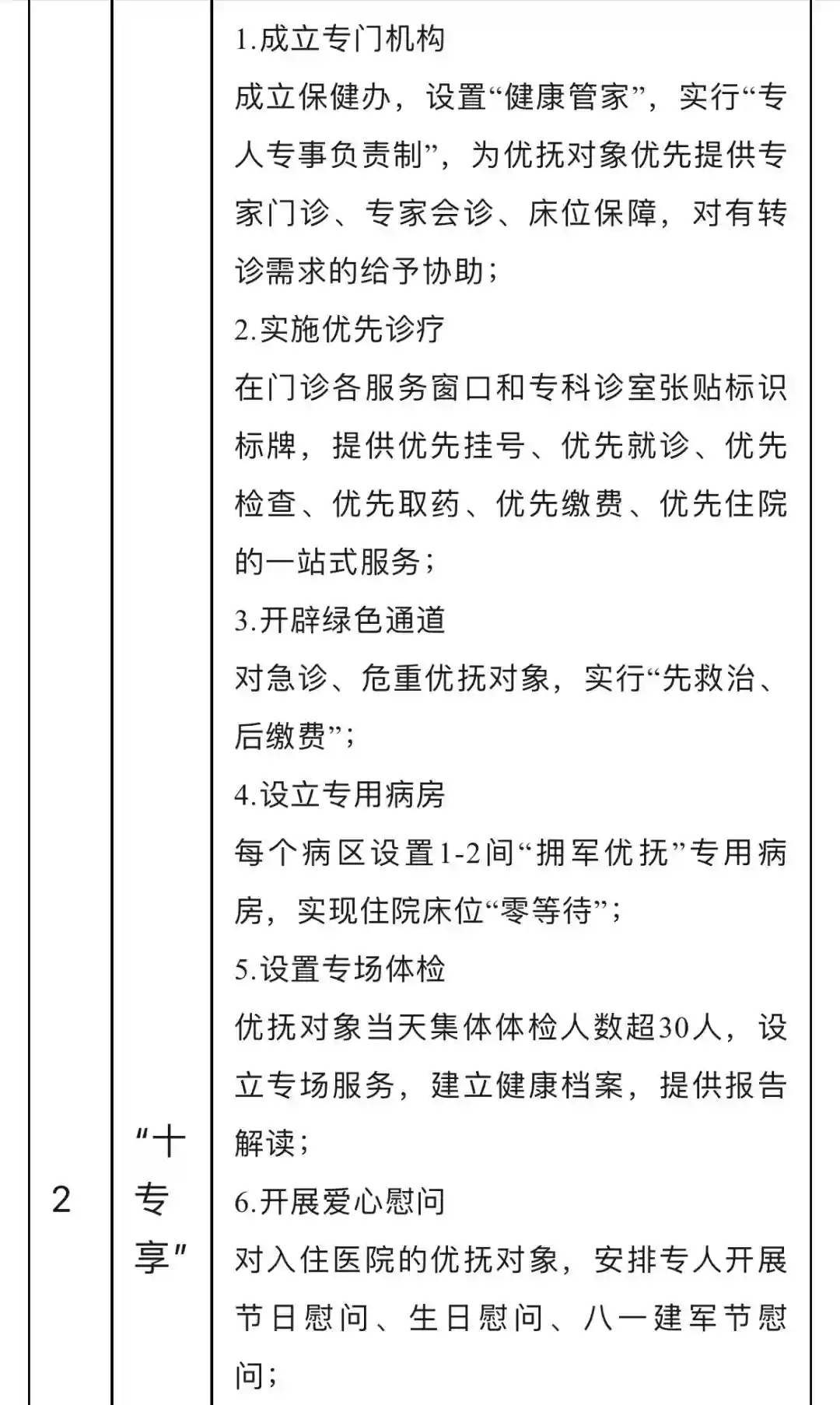 设立拥军优抚综合病区(医院1号楼三楼专属病床15张),每个病区设置1-2间拥军优抚专用病房。