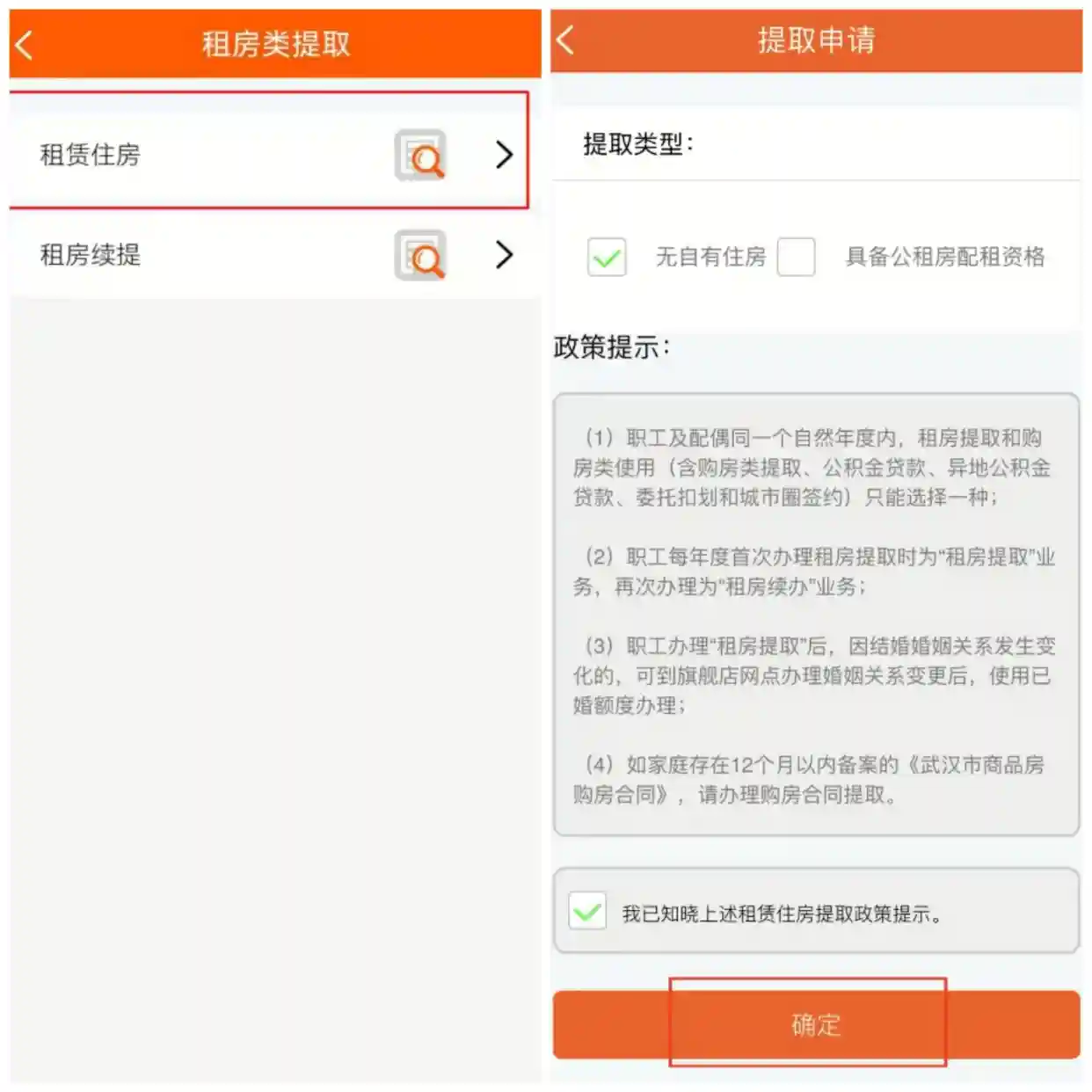 2、选择租房提取后,进入租房类型选“租赁住房”;提取类型为“无自有住房”,公租房的选“具备公租房配租资格“,然后”确定“。