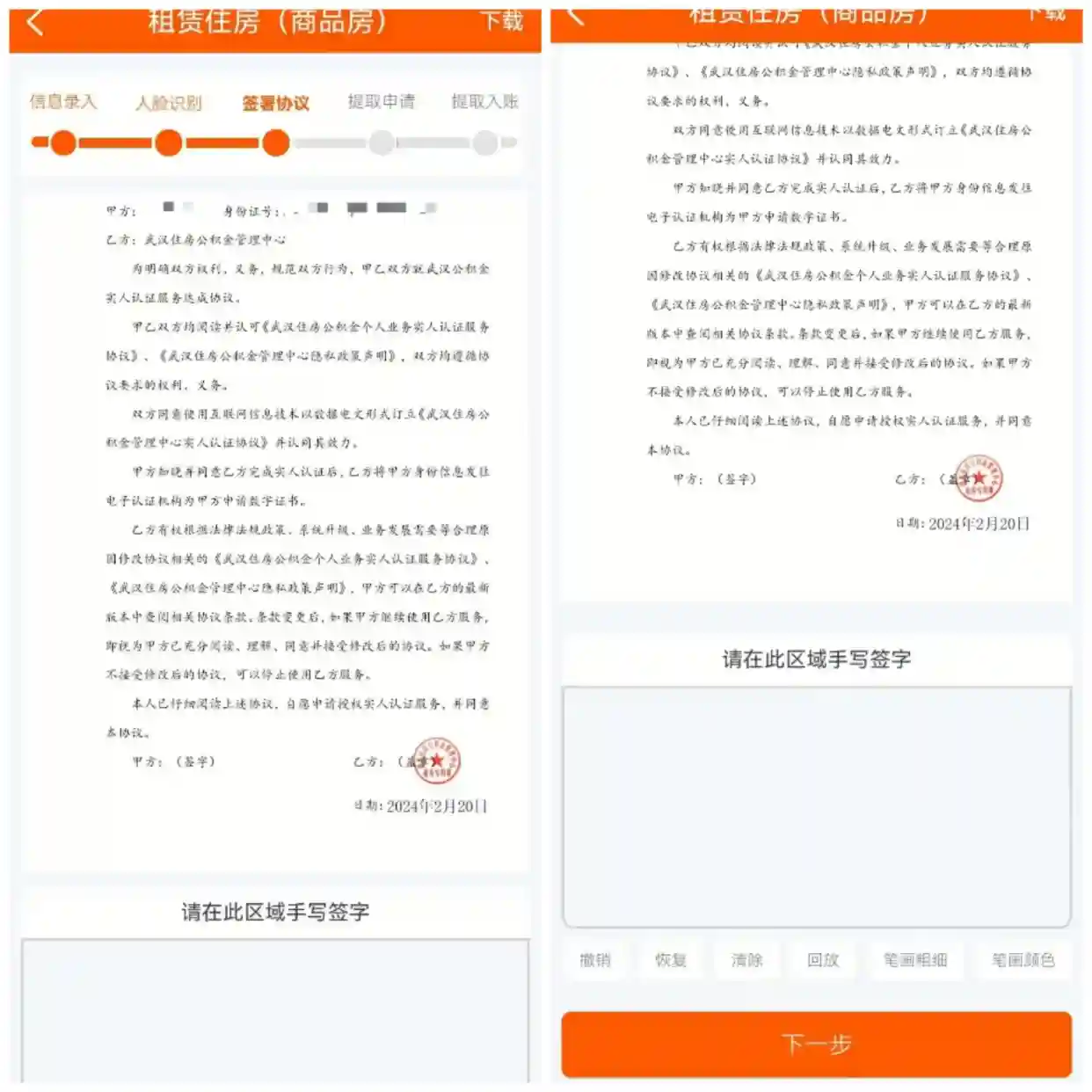 4、人脸识别后进入签署页面,单身的由要本签字后提交等待审批即可,已婚的需要本人签字配偶再确认授权后才能提交成功。