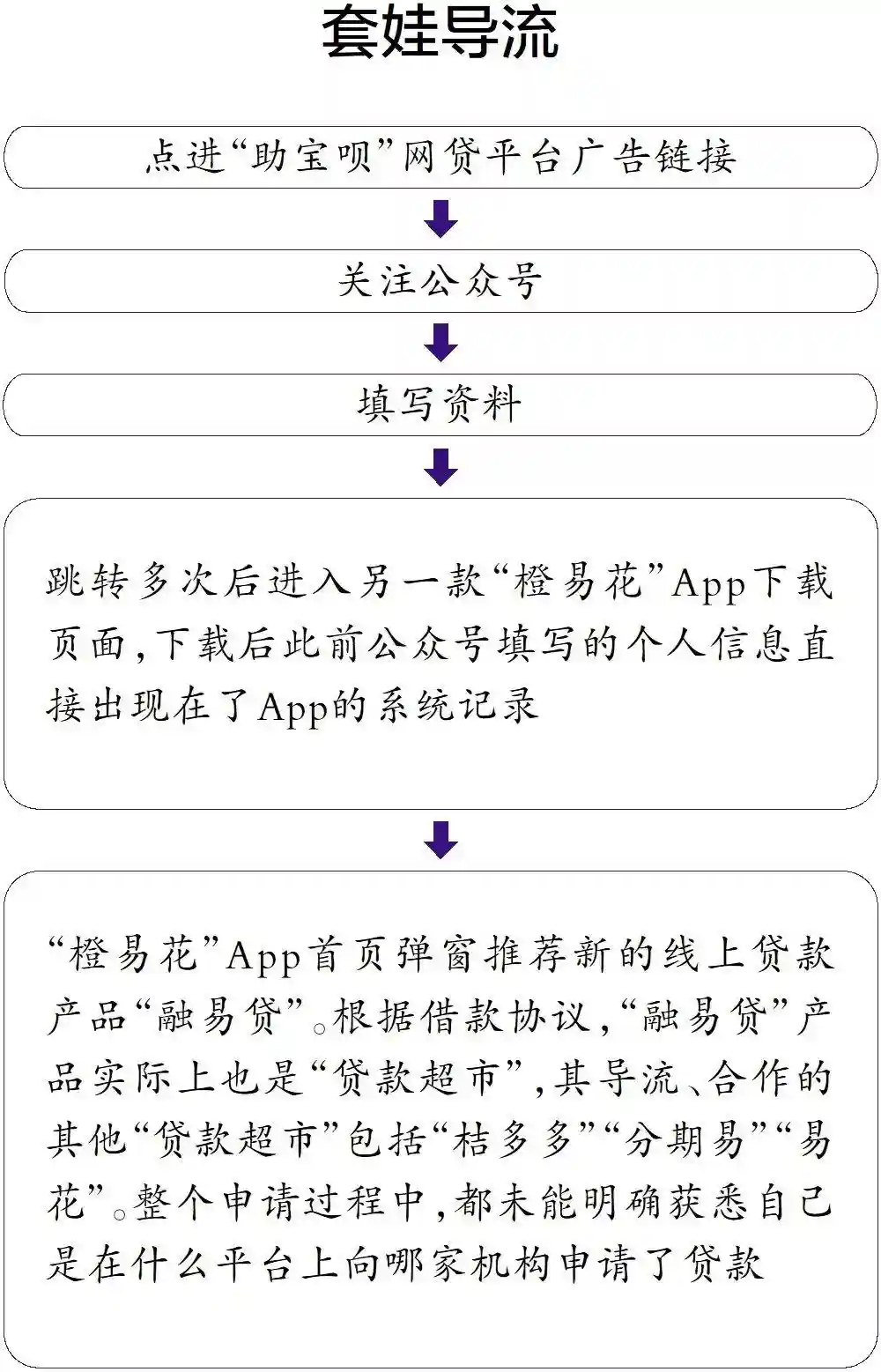 从实测可以看出,从用户最初看到的打广告的助贷公司,到实际审批贷款的公司,用户已经至少被转手导流了4、5次,用户在整个申请过程中,都未能明确获悉自己是在什么平台上向哪家机构申请了贷款。易观分析金融行业高级分析师苏筱芮指出,这些贷款广告对产品信息披露不清晰、不规范,资金方指向不明确,无法获取金融产品提供者的准确信息,将给金融消费者造成困扰及风险。
